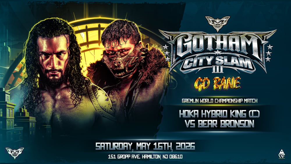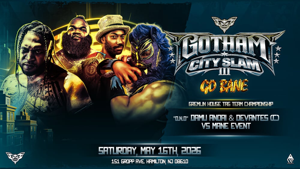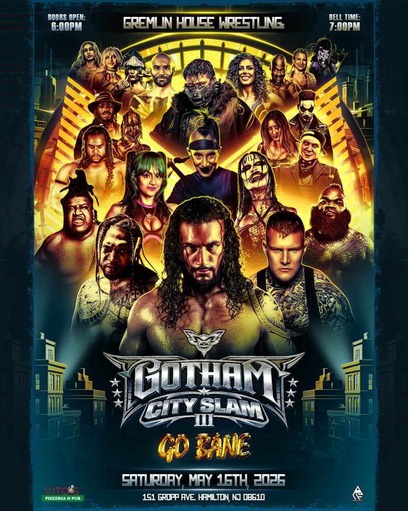 THIS TICKET INCLUDES ENTRY TO @gremlinhousewrestling presents: GOTHAM CITY SLAM lll “GO BANE” MAY 16th 2026 in HAMILTON NJ ❗️SPONSORED BY: VITOS PIZZA & PUB❗️DOORS: 6PM❗️ PROCESSING FEES INCLUDED in ticket price ❗️Chose your ticket variant below❗️